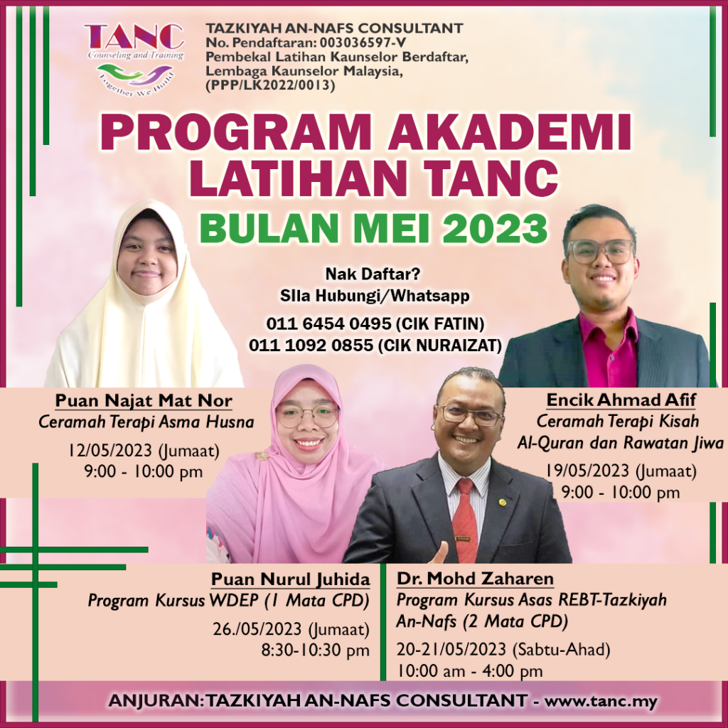PROGRAM AKADEMI LATIHAN TANC (BULAN MEI) Assalamualaikum FIRMA TAZKIYAH AN NAFS CONSULTANT Merupakan Pembekal Latihan Kaunselor Berdaftar dengan Lembaga Kaunselor Malaysia (PPP/LK/2022/00013). MEMBAWAKAN PROGRAM AKADEMI LATIHAN TANC BULAN: MEI 2023 […]
