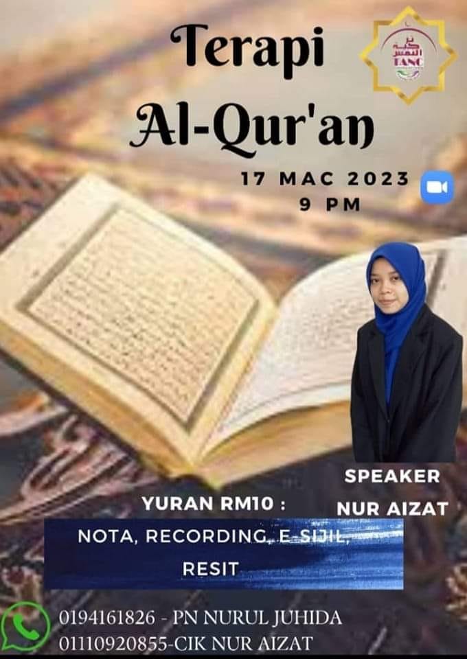 CERAMAH TERAPI AL QURAN CERAMAH TANC TARIKH: 17/3/2023(JUMAAT) PENCERAMAH: NUR AIZAT MOHMAD MOHMIDDIN MASA: 9:00PM TAJUK : TERAPI AL-QUR’AN Aplikasi Secara ZOOM HQ TANC (link akan diberi sebelum program) Tekan […]