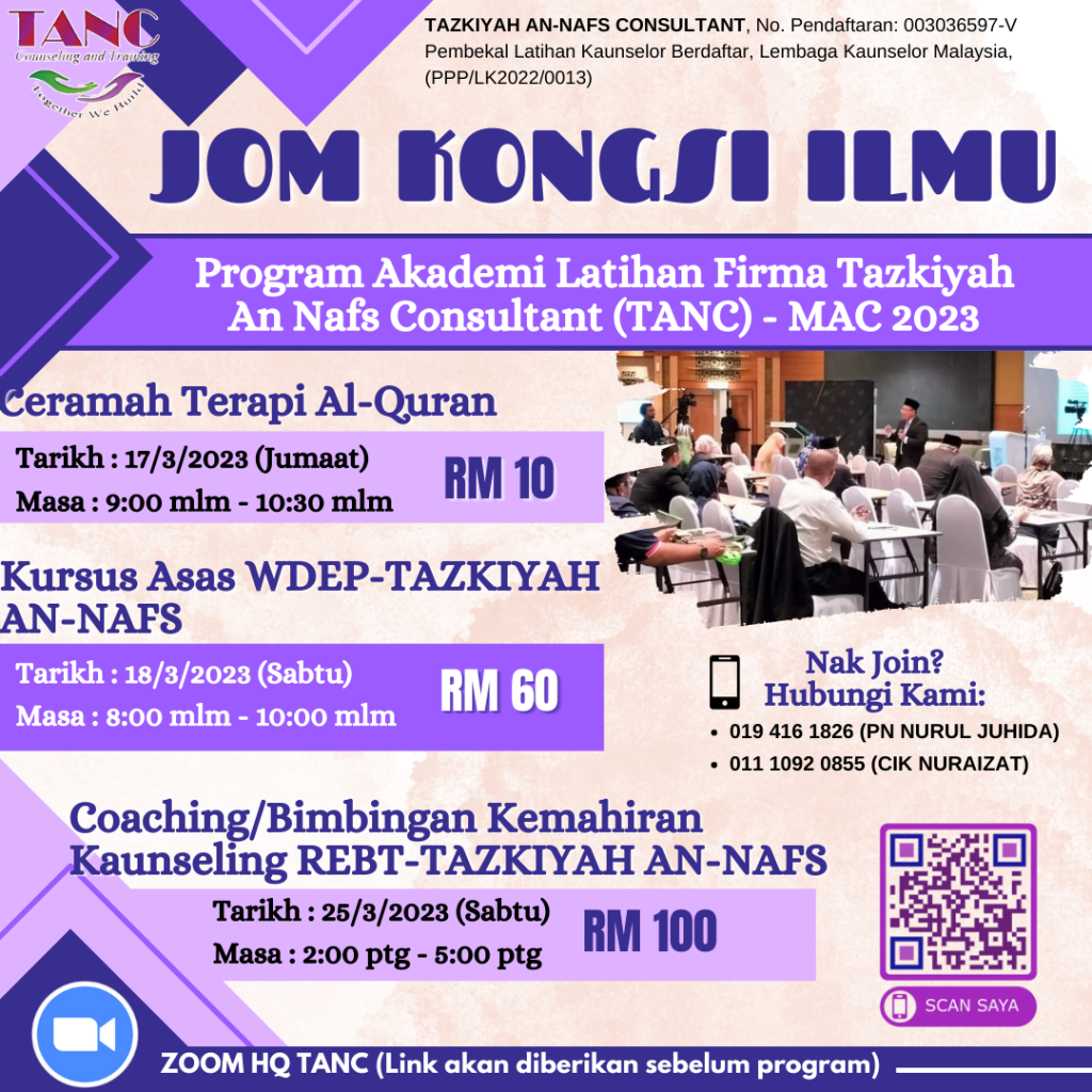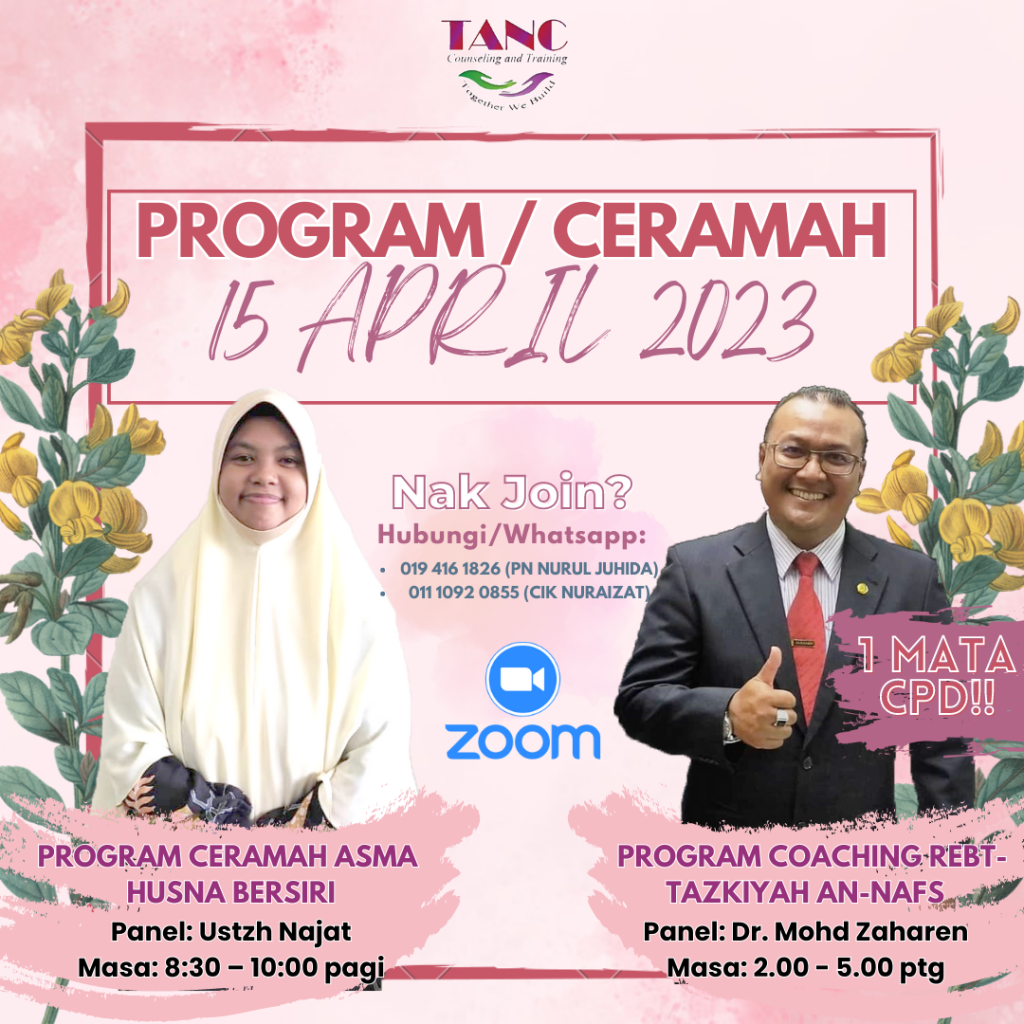 SERTAI KAMI.. PROGRAM 15 APRIL 2023 CERAMAH ASMA’UL HUSNA 8.30 – 10.00 PAGI COACHING KAUNSELING REBT-TAZKIYAH AN-NAFS 2.00 – 5.00 PTG PLATFORM: ZOOM HQ TANC Bagi Peserta Yang […]