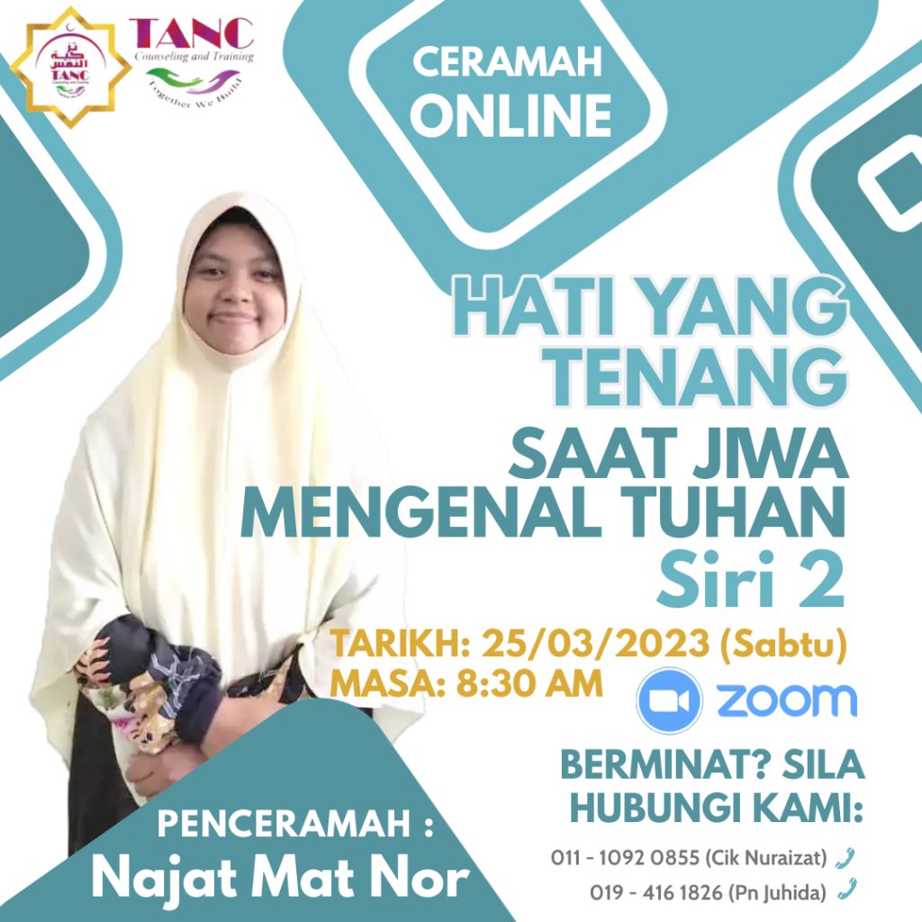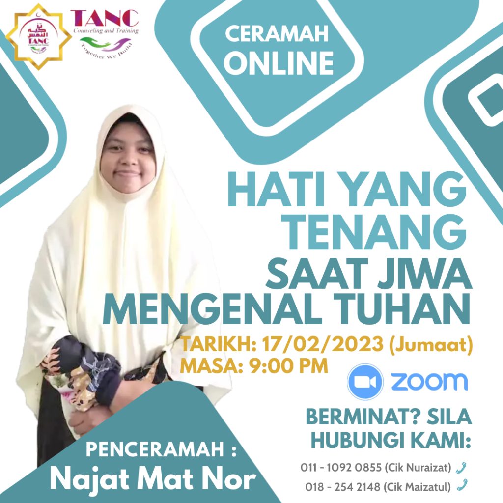 CERAMAH TANC TARIKH : 17/02/2023(JUMAAT) PENCERAMAH : USTAZAH NAJAT MAT NORMASA: 09:00 PMTAJUK : “HATI YANG TENANG SAAT JIWA MENGENAL TUHAN Aplikasi Secara ZOOM HQ TANC (link akan diberi sebelum […]